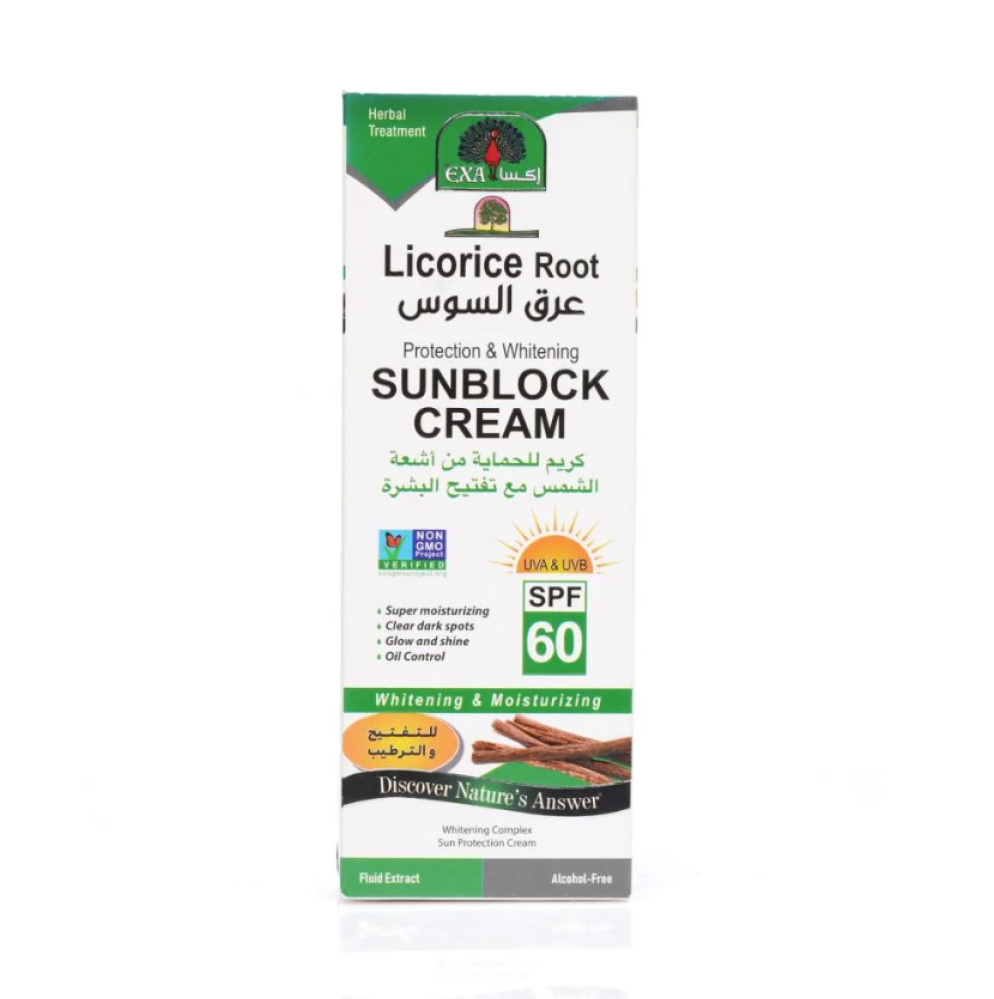 احمِ بشرتك من أشعة الشمس الضارة مع إكسا كريم واقي الشمس بعرق السوس. يحتوي هذا الكريم على مكونات فعّالة توفر حماية عالية ضد الأشعة فوق البنفسجية (UV) وتعمل على تفتيح البشرة بفضل عرق السوس. يمنحك الحماية المثالية ويعزز إشراقة بشرتك في نفس الوقت.