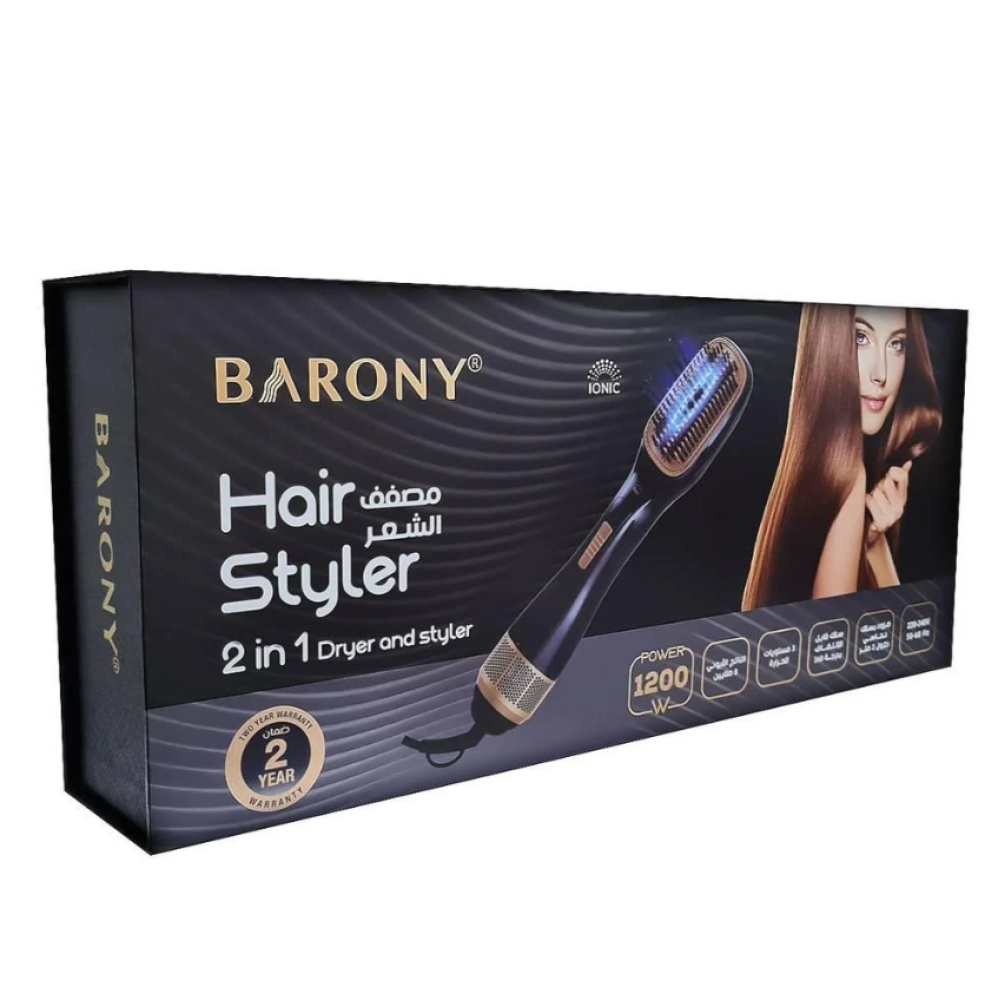 باروني مصفف الشعر 2 في 1 مصمم ليعمل كمجفف ومصفف بقدرة 1200 واط، يساعد على تجفيف الشعر وتصفيفه بفعالية باستخدام تقنية الأيونات.