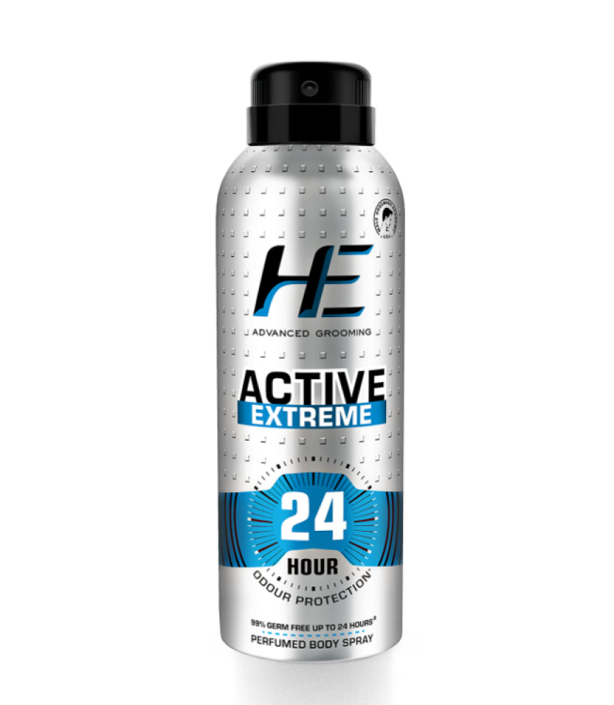 بخاخ معطر للجسم HE Active Extreme 150 مل للرجال النشطين اليوم، حماية من الروائح لمدة 24 ساعة* خالٍ من الجراثيم بنسبة 99% لمدة تصل إلى 24 ساعة