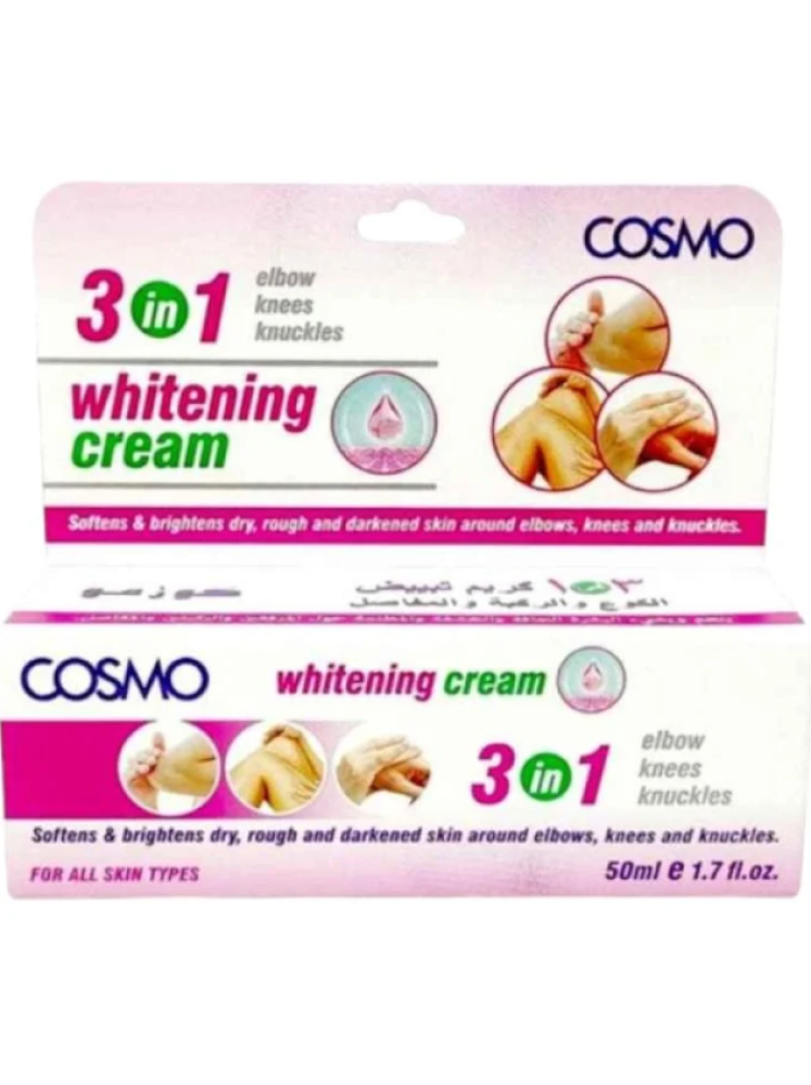 هل تعانين من اسمرار وخشونة في الأكواع، الركب، أو المفاصل؟ لا تقلقي! كريم كوزمو 3 في 1 هو الحل المثالي لتفتيح وترطيب هذه المناطق، ليمنحك بشرة أكثر نعومة وإشراقًا.