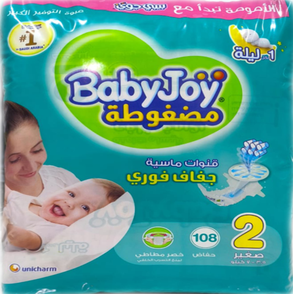 بيبي جوي – حفائض مضغوطة مقاس 2 صغير – 3.5-7 كجم عبوة التوفير الكبير 108 حفاض