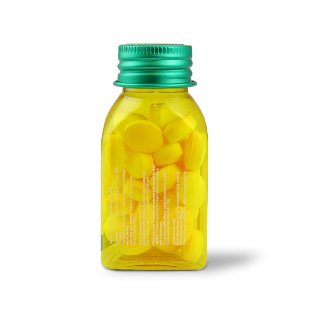 حلوى منعشة بطعم المانجو، خالية من السكر، تحتوي على فيتامين سي للمساهمة في دعم الصحة العامة ومنح إحساس بالانتعاش.