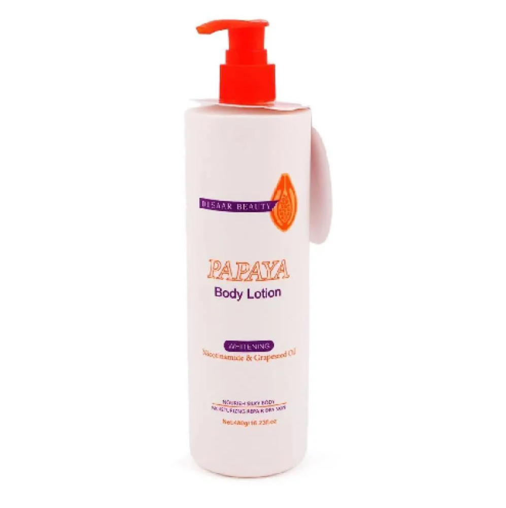 ديسار لوشن تفتيح وترطيب للجسم بخلاصة البابايا يحتوي بتركيبته المتطورة على نسبة عالية من المواد المرطبة لبشرة صحية ومشرقة. إن تركيبته الخفيفة تمتصها البشرة بسرعة لتبقيها ناعمة ورطبة ونضرة طوال اليوم. الاستخدام المتكرر يعطي بشرة مشرقة ورطبة.