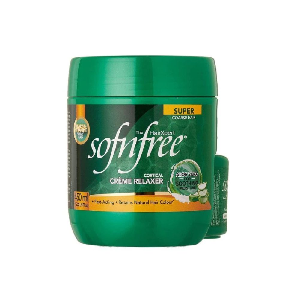 كريم فرد الشعر سوفن فري يمنح فردًا ناعمًا وطويل الأمد مع تغذية الألوفيرا لترميم الشعر وحمايته.