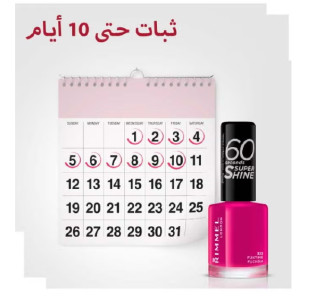 استمتعي بإطلالة لندن. لذا يمكنك فعل ذلك من ريميل لندن، يأتي طلاء 60 سكندز سوبر شاين، بلون فان تايم فوشيا، بينك غامق يُوضع بسرعة ويجف بسرعة بحيث يمكنك تغيير مظهرك كل يوم. هذه التركيبة مقاومة للتقشر، ومقاومة للبهتان، ولمعان عالي، وتدوم حتى 10 أيام وأنيقة للحصول على لمسة نهائية احترافية خالية من العيوب. لذا سواء كنتِ تعملين أو تتسوقين أو في مناسبة خاصة أو خارجة مع البنات. استخدمي فرشاة إكسبرس من أجل استخدام بسيط وسريع ومتجانس في ثانية واحدة. طلاء أظافر 60 ثانية فان تايم فوشيا هو دعامة أساسية أنيقة لمجموعة ألوان الأظافر الخاصة بك أو ستلقى ترحيبًا حارًا عند استلامها كهدية إذا كنت تبحث عن مشاركة متعة ريميل لندن مع الآخرين. ريميل هي واحدة من أفضل العلامات التجارية لمستحضرات التجميل في المملكة المتحدة ووجه ستايل لندن. تعيش ريميل من أجل تمرد الألوان في الشوارع والنوادي الحيوية والبارات المخفية. تلتهم ريميل بالموسيقى والطاقة وتعود للحصول على المزيد. تؤمن ريميل بالموضة بدون قواعد وقيم كل فرد يجسد للجمال. يتم الاحتفاظ بمظهر ريميل الرائع، ونطاق أسعار رائع في كل لحظة لأنه يجسد مظهر لندن إلى درجات لون ومنتجات وتغليف وإعلانات مختلفة. ولكن على الرغم من أن منتجات ريميل مبتكرة وذات تصميم عصري، فهي سهلة الاستخدام ومتعددة الاستخدامات وسهل الوصول إليها، ومصممة لتشجيع التجريب والتعبير الذاتي. تمتعي بإطلالة لندن.