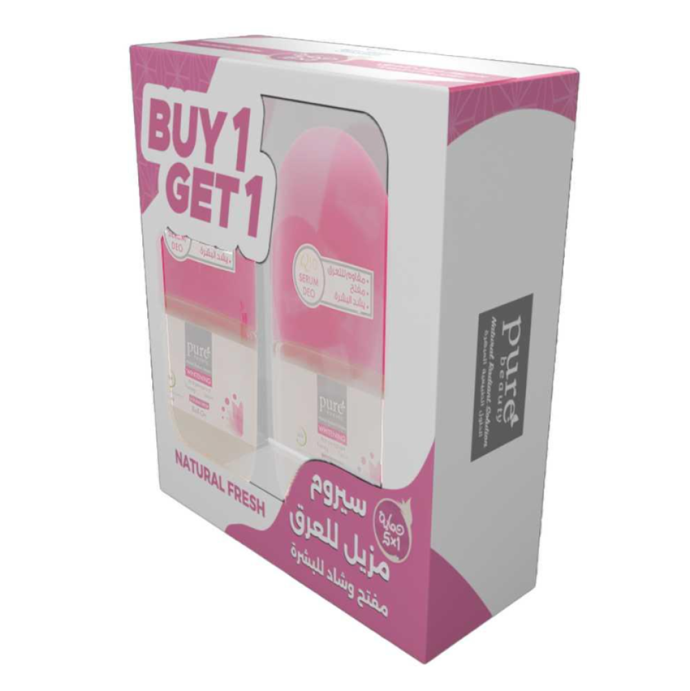 عرض مزيل عرق رول أون مع تفتيح البشرة برائحة خفيفة من بيور بيوتي يتكون من حبة + حبة مجاناً. يحتوي على مكونات فعالة تحمي من التعرق وتفتيح البشرة، مع ترك رائحة خفيفة ومنعشة تدوم طوال اليوم.