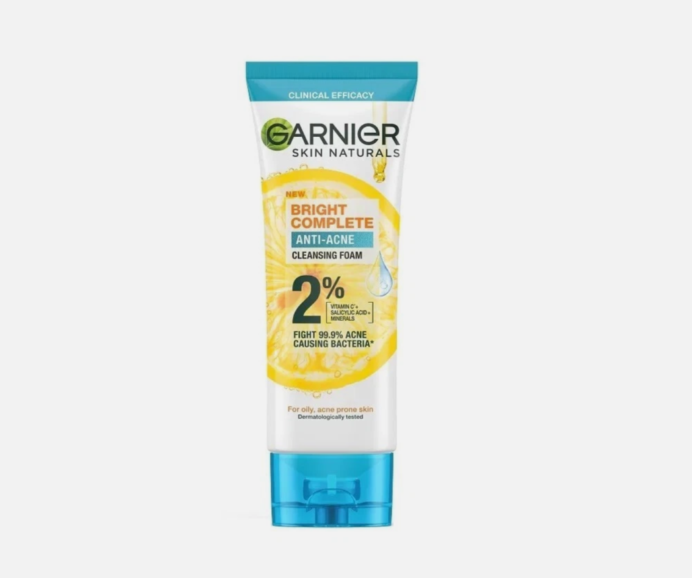 رغوة غارنييه سكين ناتشورالز برايت كومبليت المنظفة المضادة لحب الشباب، 100 مل، بمزيج من 2% فيتامين سي وحمض الساليسيليك والمعادن الطبيعية. تساعد على تنقية البشرة لتبدو أكثر إشراقًا، وتقليل تراكم البكتيريا، أحد أسباب حب الشباب بنسبة 99.9%.