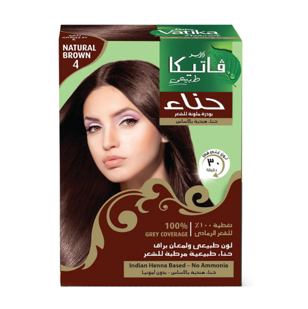 فاتيكا حناء طبيعية بلون بني تمنح شعرك لونًا غنيًا وطبيعيًا مع تغذية عميقة بفضل مكوناتها العشبية، لتعزيز صحة الشعر ولمعانه بدون مواد كيميائية قاسية.