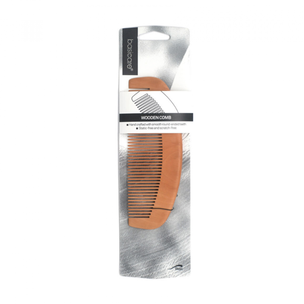 مجموعة فرش ومشط خشبية من بيسك كير، مصممة للعناية بالشعر وفك التشابك بلطف، مع الحفاظ على نعومة ولمعان الشعر دون التسبب في تكسره.