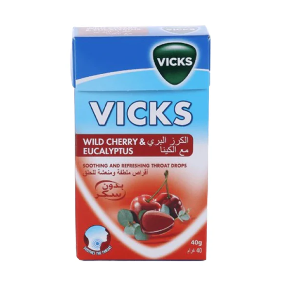 ملطف ومنعش، يخفف التهاب الحلق واحتقان الأنف. خالي من السكر، بنكهة الكرز.