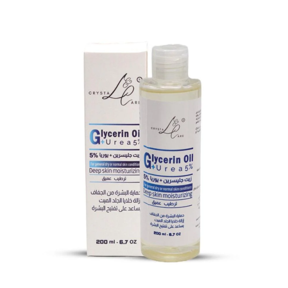 كريستال اند كير زيت جلسرين +يوريا 5% يُساعد وضع الجلسرين على زيادة رطوبة البشرة ما يجعلها نضرة ويجعلها تبدو بمظهر أكثر صحة، كما أنه يقلل من ظهور التجاعيد والخطوط الرفيعة، وبالتالي إبطاء ظهور علامات الشيخوخة. يُعد الجلسرين السائل من المواد التي لا تحتوي على الزيوت ما يجعله أحد أفضل المكونات التي تُساعد على محاربة حب الشباب، كما أنه لا يُسبب أي تهيجات أو التهابات، ولا يسد المسام عند تطبيقه على البشرة، وبالتالي يقلل من ظهور البثور وحب الشباب وبشكل خاص للبشرة الدهنية. يتميز زيت الجلسرين باليوريا بترطيبه الفعّال للبشرة الجافة فهو مفيد جدًا بعد مرحلة التقشير من كريم اليوريا