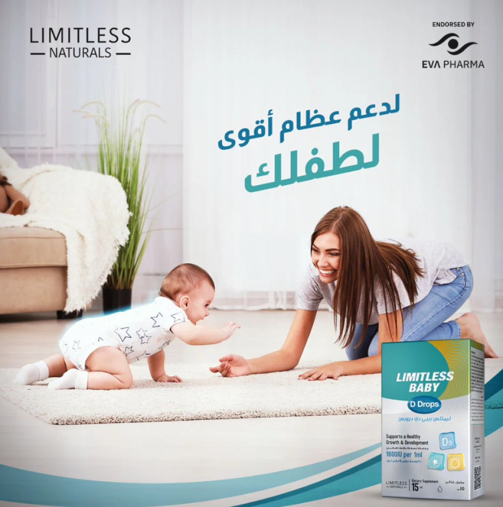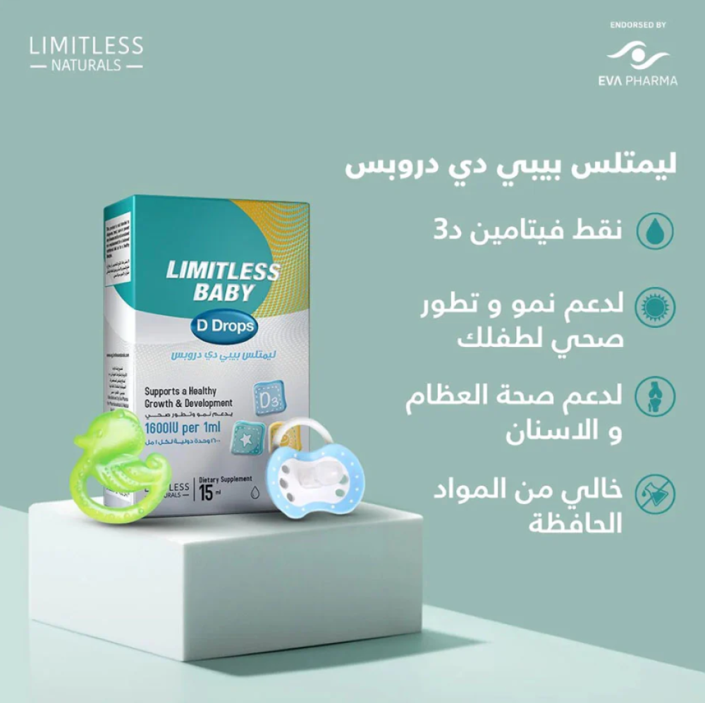 ليمتلس بيبي دي دروبس limitless baby d drops لدعم نمو و صحة الاطفال فهو عبارة عن فيتامين د3 الفعال لدعم صحة العظام والاسنان و الوقاية من حالات نقص فيتامين د و هذا نتيجة احتواءة علي مكون اساسي و هو فيتامين د3 والذي يتم انتاجة في في الجلد بعد التعرض لاشعة الشمس.