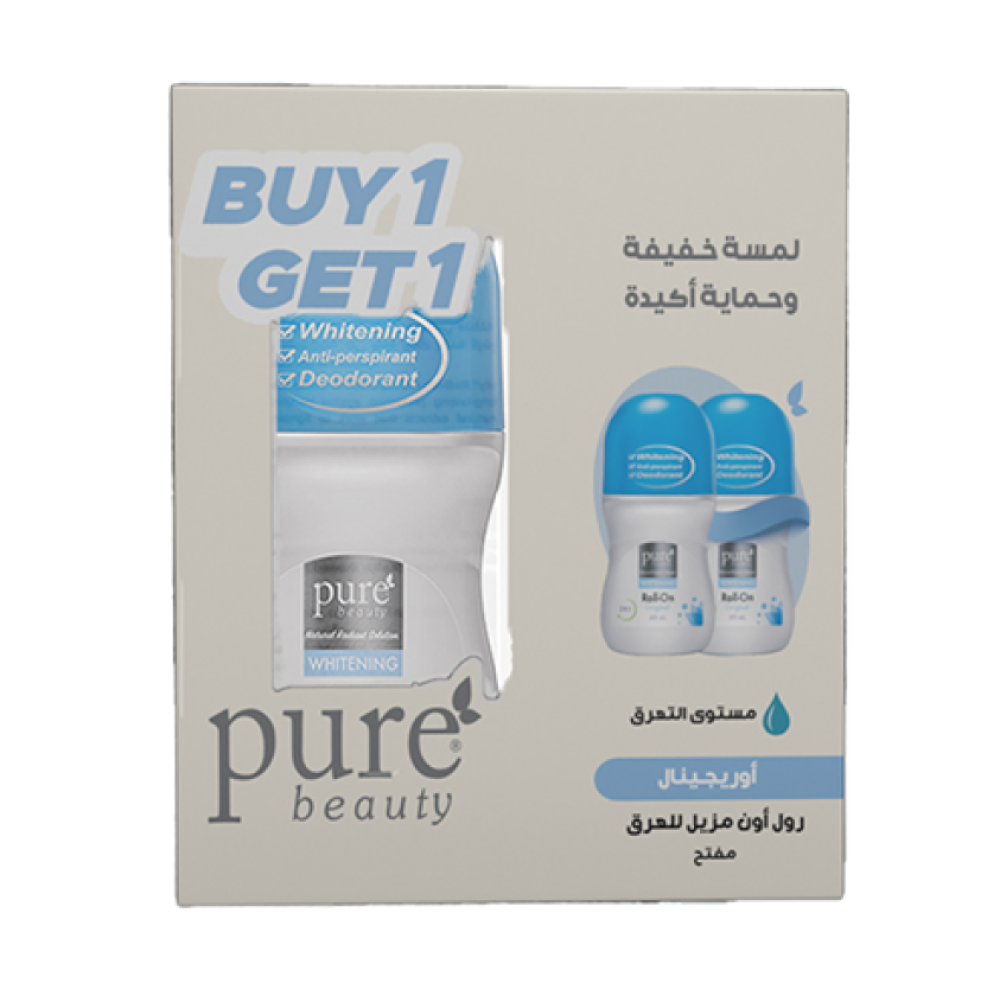 عرض مزيل عرق رول أون الأصلي مع تفتيح البشرة من بيور بيوتي يتكون من حبة + حبة مجاناً. يحتوي على مكونات فعالة تحمي من التعرق وتفتيح البشرة، مع ترك رائحة منعشة تدوم طوال اليوم.