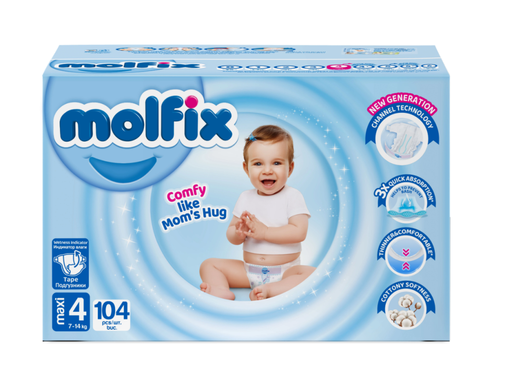 – حفاضات مولفيكس مقاس 4 مصممة خصيصًا للأطفال الذين يتراوح وزنهم بين 7-14 كغم.