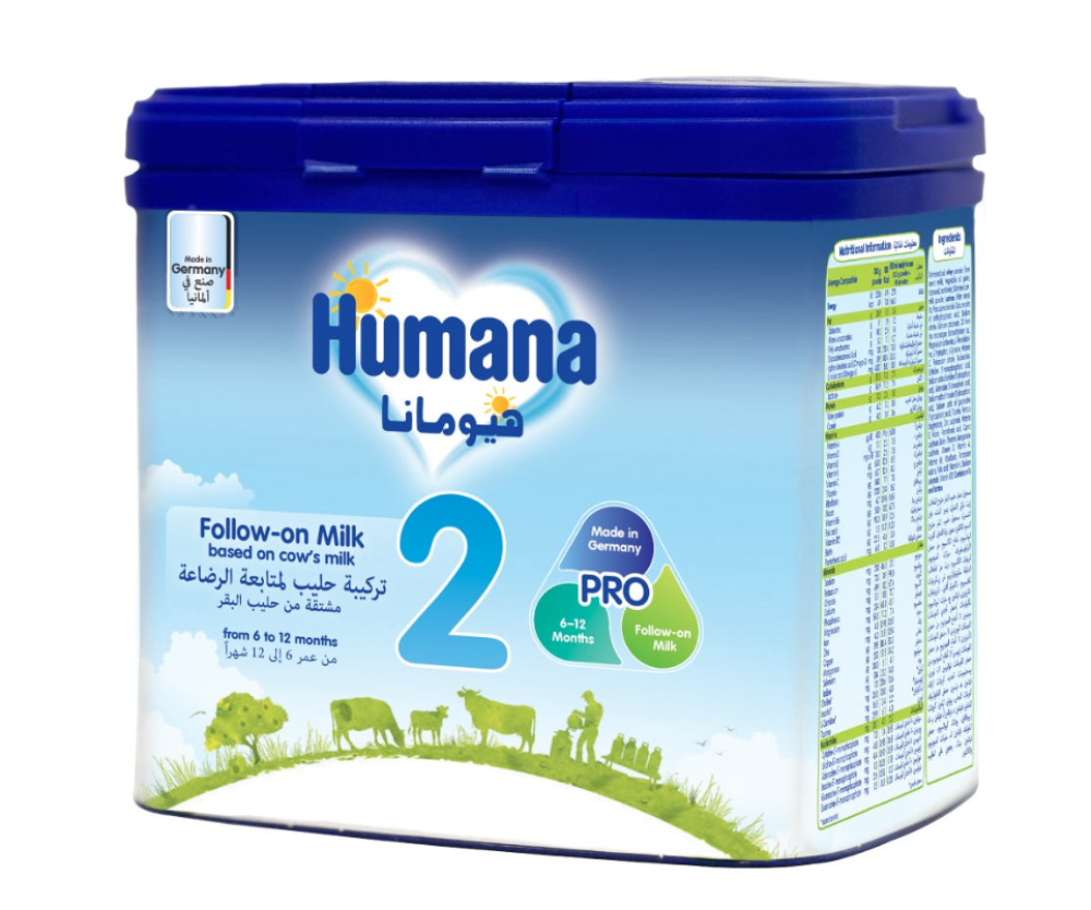 تركيبة حليب هيومانا 2 للرضع من 6 حتى 12 أشهر. حليب هيومانامصنوع في ألمانياوخالي من المواد المعدلة وراثياً و يحتوي علىبرو بالنس™.