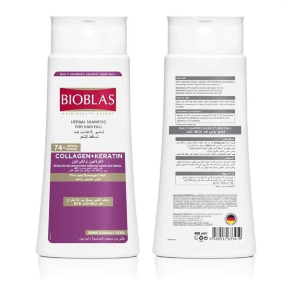 بيوبلاس شامبو كولاجين وكيراتين 400 مل هو منتج متطور يهدف إلى تعزيز صحة الشعر وفروة الرأس بفضل تركيبته الفريدة التي تجمع بين الكولاجين والكيراتين. هذا الشامبو مصمم خصيصًا لتغذية الشعر التالف وإعادة له حيويته ونعومته، مما يجعله الخيار الأمثل لمن يعانون من الشعر الجاف أو التالف.