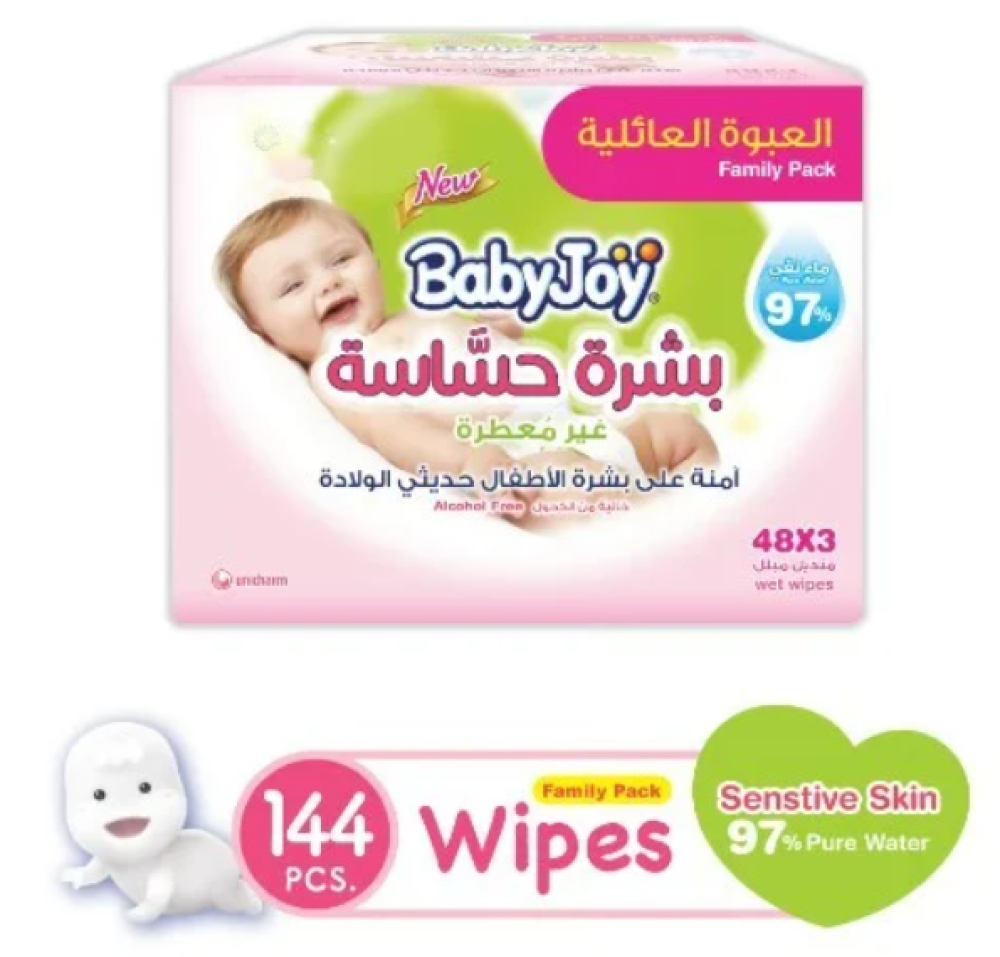 مناديل بيبي جوي المُبلله بنوعيها “بشرة صحية” و “بشرة حساسة” لطيفة على بشرة طفلك تنظف بفعالية وتحتوي على 97% ماء نقي