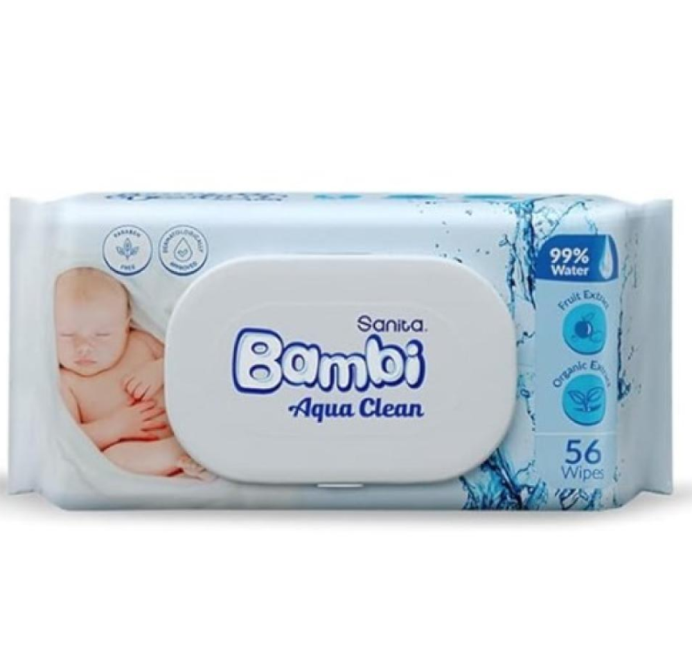 سانيتا بامبي أكوا كلين مناديل مبللة نظافة مائية 56 منديل**: مناديل مبللة مصممة خصيصًا لتنظيف البشرة بلطف وفعالية. تحتوي على تركيبة مائية تجعلها مثالية للاستخدام على البشرة الحساسة، بما في ذلك بشرة الأطفال.
