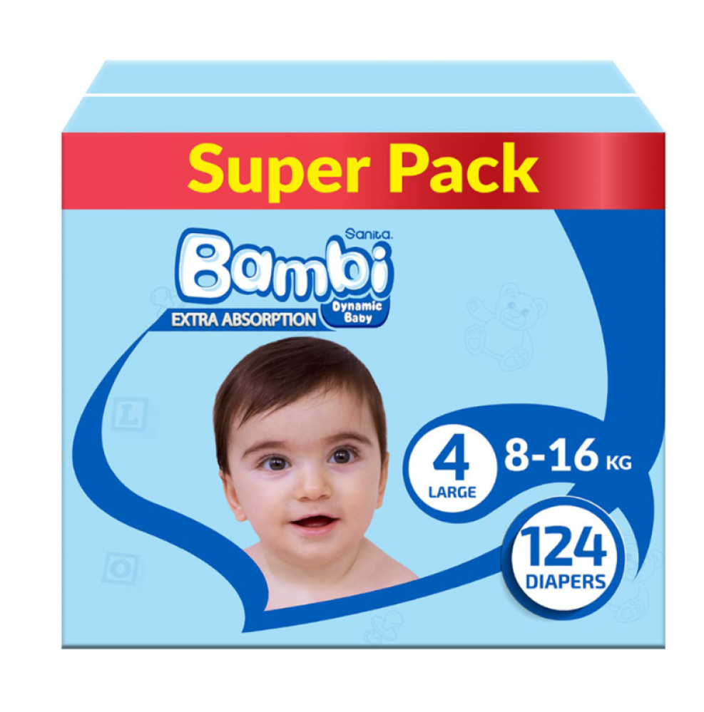 حفاضات بامبي مقاس 4 بتقنية الامتصاص العالي توفر لطفلك حماية مثالية وراحة تدوم طويلاً، مع تصميم مميز يناسب الأطفال بوزن 8-16 كجم، وتأتي بعبوة سوبر باك اقتصادية تحتوي على 124 حفاضة.
